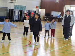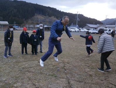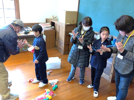 地域の方々に協力していただいて昔遊び交流会を実施しました。外遊びでは「おんせん」