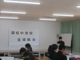 | 1学期生徒総会 4月30日(木)に今年度最初の「御杖中学校生徒総会」が開かれ、本年度の生徒会・各委員会の活動計画案、予算案が承認されました。 活動計画案について、生徒会からは「みんなが笑顔でいられる楽しい御杖中学校!!!!!」、保健・体育・美化委員会からは「宇陀一美しい校舎に」、図書・放送・給食委員会からは「多くの人に本を読んでもらえるように」とそれぞれの長から目標の案が提示されました。質疑・応答の時間も1年生から3年生まで活発に意見や質問が出され、校訓である「進取・独立・自治」を体現した時間となりました!この半年間の「みんなが笑顔でいられる」活発な生徒会の活動に期待したいです。 |